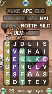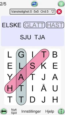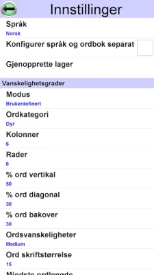 Dykke ned i et vell av konfigurasjonsmuligheter som lar deg finjustere hvert eneste aspekt av spillet. Definer nøyaktig rutenettstørrelse, fra intime 3x3 til massive 20x20, og selv asymmetriske formater er mulig. Juster vanskelighetsgraden ved å spesifisere hvor ofte ord skal skrives diagonalt, baklengs eller vertikalt, eller fjern disse helt for en enklere utfordring. Tilpass ordbokens størrelse for å passe ditt nivå, fra en selektiv samling av 500 vanlige ord – perfekt for språkelever – til en omfattende database på 80 000 ord. Bestem maksimalt antall ord per spill og finjuster minimum og maksimum ordlengde for å skreddersy utfordringen nøyaktig etter dine preferanser, enten du vil unngå mange korte ord eller målrette deg mot spesifikke lengder. Du kan til og med velge spesifikke ordkategorier som dyr eller mat, og velge om funnet ord skal fremheves eller om du foretrekker et rent rutenett.