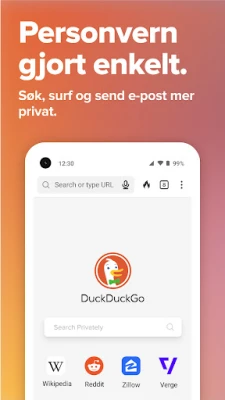 Opplev internett som det var ment å være – fritt, åpent og uten overvåkning. Med **DuckDuckGo** får du en kraftpakke for personvern som gjenoppretter kontrollen over din digitale tilstedeværelse. Søk på nettet uten spor – vår innebygde private søkemotor sørger for at din søkehistorikk forblir din egen, uten noen form for profilering. Mer enn bare en nettleser, **DuckDuckGo** arbeider proaktivt for å blokkere de skjulte nettstedsporerne *før* de får en sjanse til å samle inn data om deg, langt utover hva de fleste standard nettlesere tilbyr. Dessuten sikrer vi automatisk at tilkoblingene dine er krypterte med HTTPS, noe som beskytter verdifulle data mot nysgjerrige øyne på offentlige nettverk eller fra internettleverandøren din.
