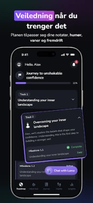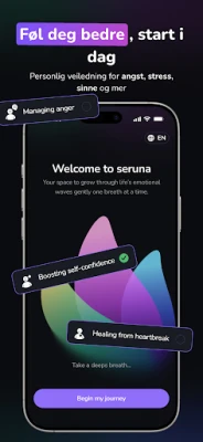 Enten du er nybegynner innen mindfulness, en student, en travel profesjonell, eller ønsker støtte for ADHD, tilbyr Seruna lavterskelhjelp. Velg et tema som "Redusere angst" eller "Mer ro før leggetid", og følg en enkel daglig rutine. Loggfør følelsene dine, reflekter i journalen, utfør en meditasjon eller CBT-øvelse, og avslutt med mindfulness. Luma tilpasser kontinuerlig forslagene for å møte deg der du er. Seruna støtter din mentale helse med metoder inspirert av terapi, men er viktig å merke seg at den ikke erstatter profesjonell behandling. Dine tanker er private, og Seruna verner om personvernet ditt med respekt og tydelige grenser, slik at du alltid har kontroll.